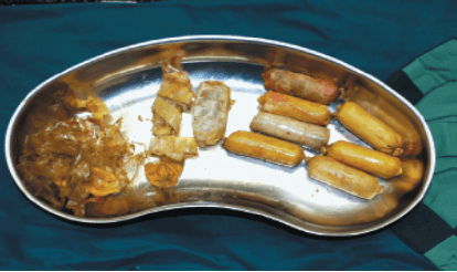 Onder rechts: gescheurde, en nog intacte bolletjes aangetroffen bij laparotomie