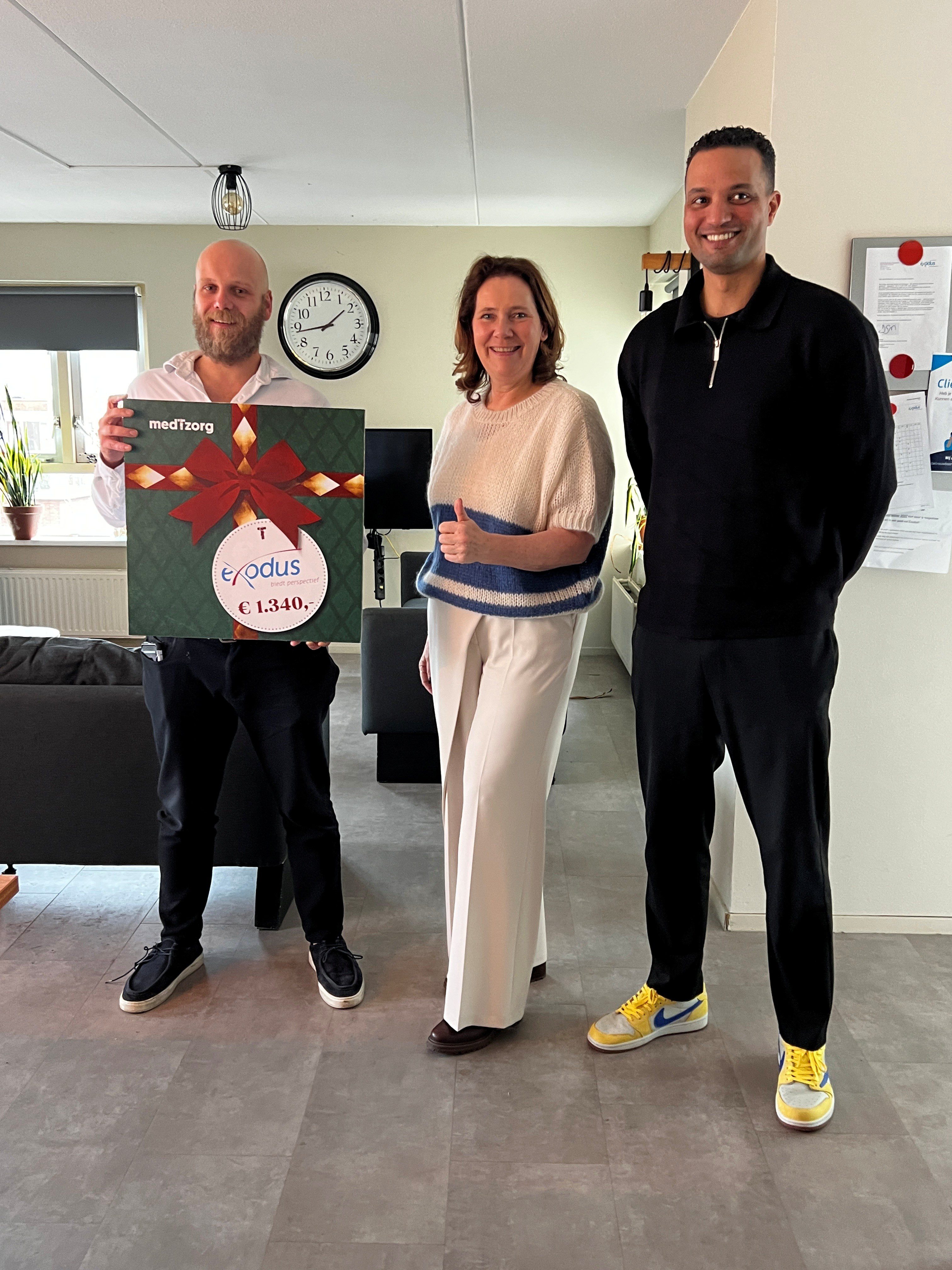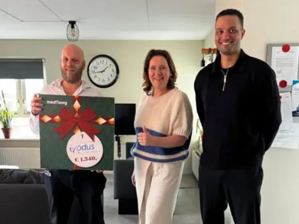 Jan Diepersloot, directeur van medTzorg, overhandigde onlangs symbolisch een bedrag van € 1.340,- aan Exodusbestuurder Monique van Schaik. Met een speciale kerstactie hebben medewerkers van de medTzorg Groep in december 2025 geld voor haar organisatie opgehaald.